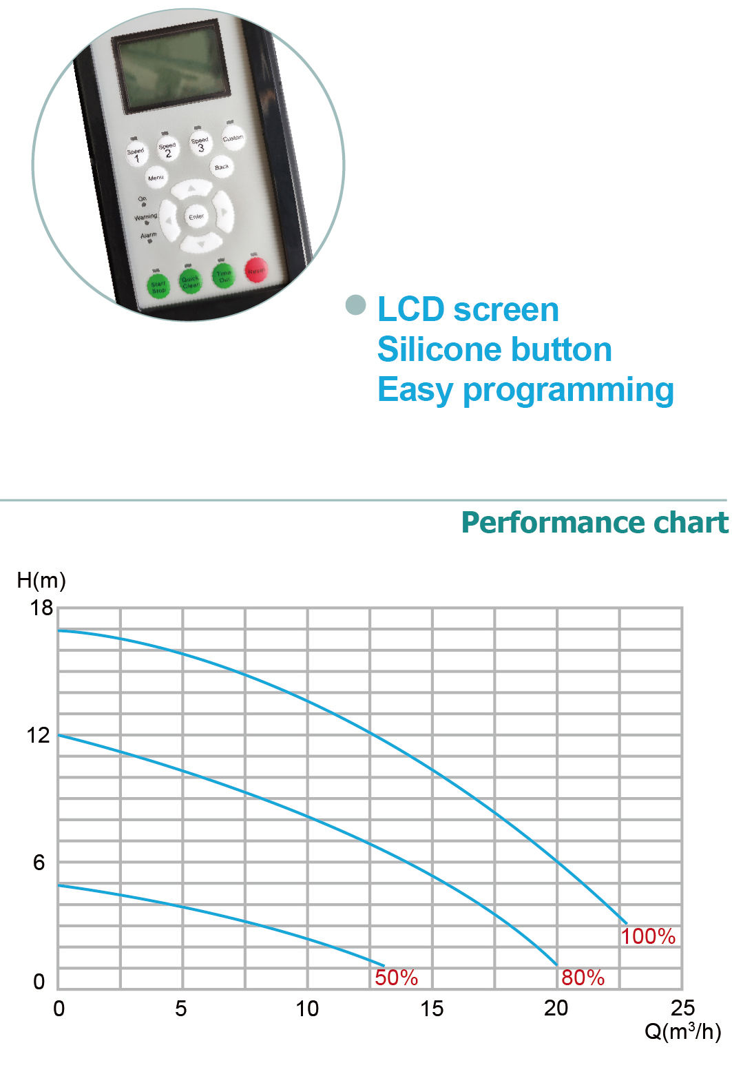 1. Moteur de qualité super efficace, faible vibration et faible bruit, efficace, durable. 2. Contrôle d'écran LCD, bouton de silicone, programmation facile. Interface de fonctionnement conviviale, Affichage virtuel de la pompe à eau Comprenez le système de mesure des paramètres et de contrôle permettant à l'utilisateur de collecter la gestion des données en fonction de ses propres besoins. 3. 4.At la puissance d'entrée de 50 Hz ou 60 Hz, les performances de la pompe restent constantes.